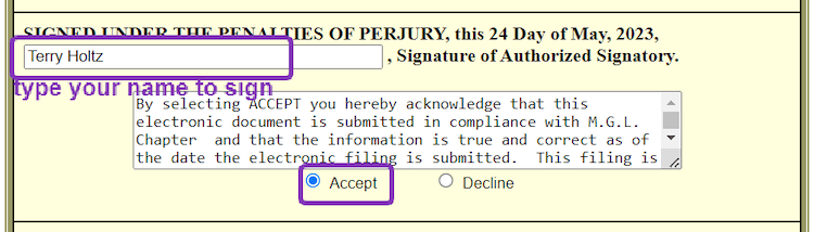 A person authorized by the LLC must sign documents filed in Massachusetts. You don’t have to be a Member (owner) or Manager, just an authorized person.