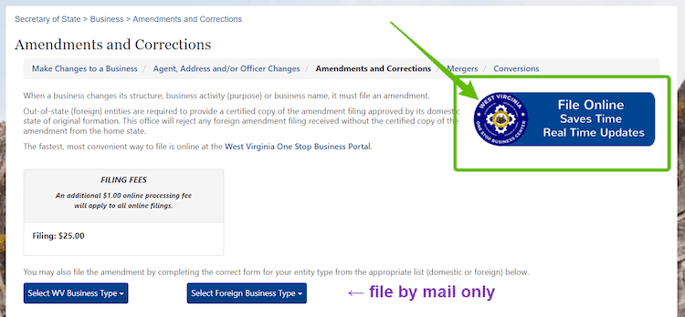First, go to the West Virginia Secretary of State Amendments and Corrections page.