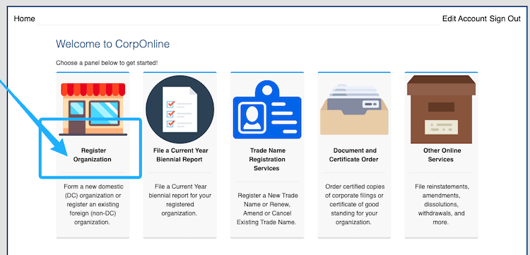 The instructions below are for how to form an LLC in the District of Columbia online.