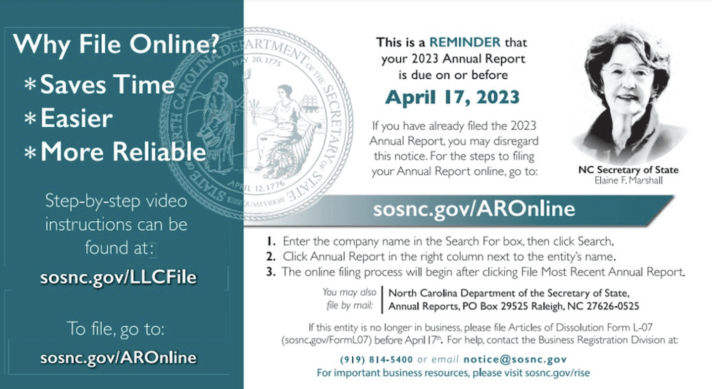 Even if you don’t receive a reminder notice, it’s still your responsibility to file your North Carolina Annual Report on time every year.