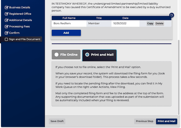 If you’d rather print out the form to mail the filing and send a check, you can select the Print and Mail option instead. Make your check payable to “Department of State” for $5.