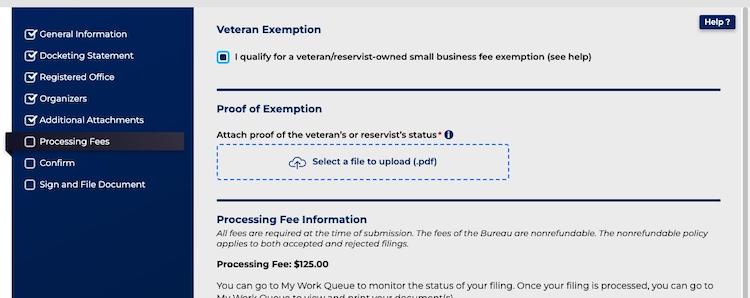 When you reach the Processing Fees screen, check the box to indicate you qualify for the Veteran Exemption. Then upload one of the documents above as proof of your veteran status.