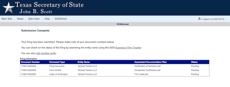 This is a little longer than the typical Texas LLC approval time of 4-5 days, because the new veteran owned businesses must use SOSUpload to file.