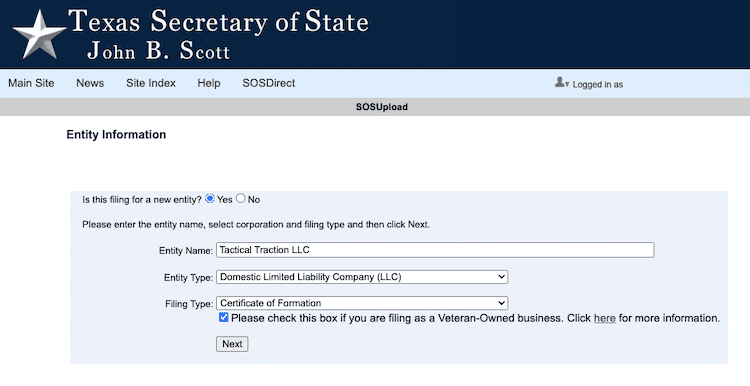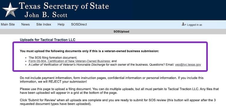 The Texas Secretary of State actually has 2 online filing methods: SOSDirect and SOSUpload. You can’t form a Texas Veteran LLC online via SOSDirect. Your Texas Veteran LLC Certificate of Formation must be filed via SOSUpload, which we’ll explain in the next section.